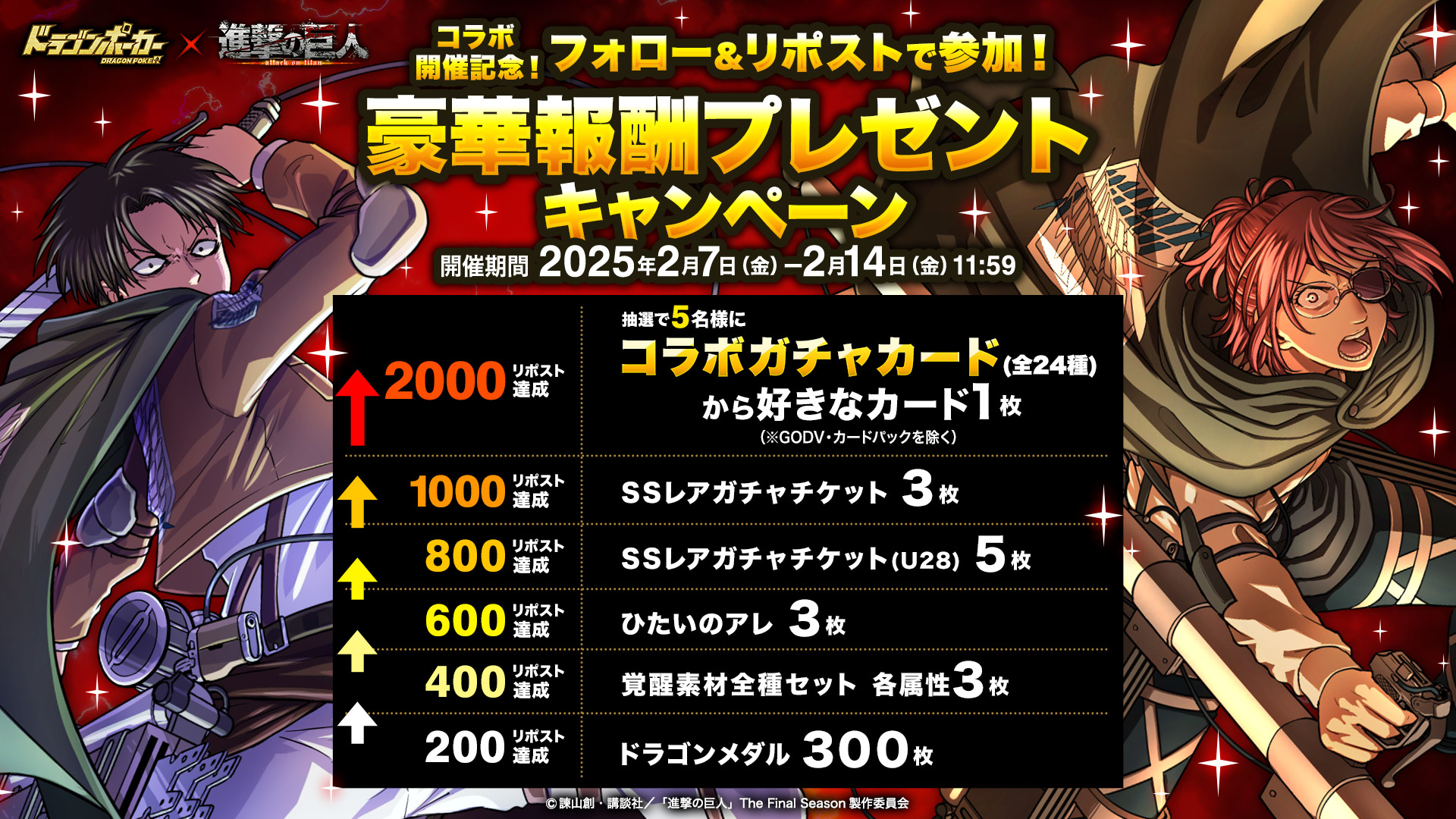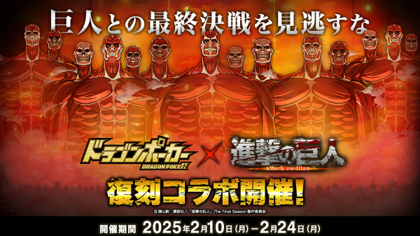 株式会社アソビズム(本社:東京都千代田区、代表取締役:大手智之)は、App Store・Google Playにて好評配信中の『ドラゴンポーカー』とTVアニメ『進撃の巨人』のコラボイベントを記念して「コラボ開催記念フォロー&リポストで参加!豪華報酬プレゼントキャンペーン」を、2025年2月7日(金)より実施することをお知らせいたします。