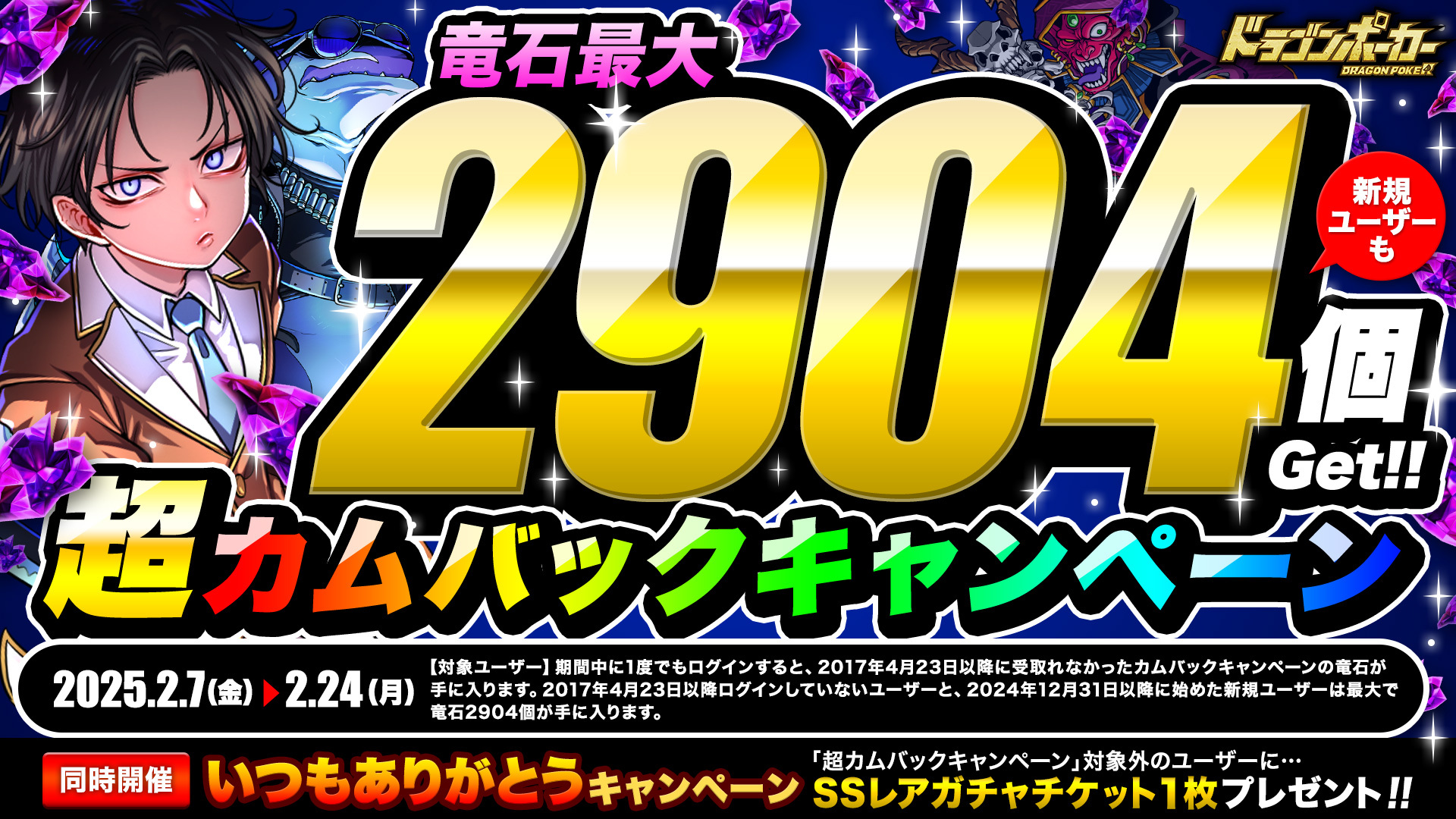 2017年4月23日以降に実施されたカムバックキャンペーンにて、ログインせずに受取れなかった竜石がまとめて手に入ります。2017年4月23日以降のカムバックキャンペーン期間中、ログインしていないユーザーに最大で竜石2904個をプレゼント!さらに、2024年12月31日以降にドラゴンポーカーを始めたユーザーにも竜石2904個プレゼント!これを機会に、ログインして大量の竜石をGETしましょう。また、いつも『ドラゴンポーカー』をプレイして頂いているユーザーの皆様には感謝を込めて、「SSレアガチャチケット1枚」をプレゼントいたします。