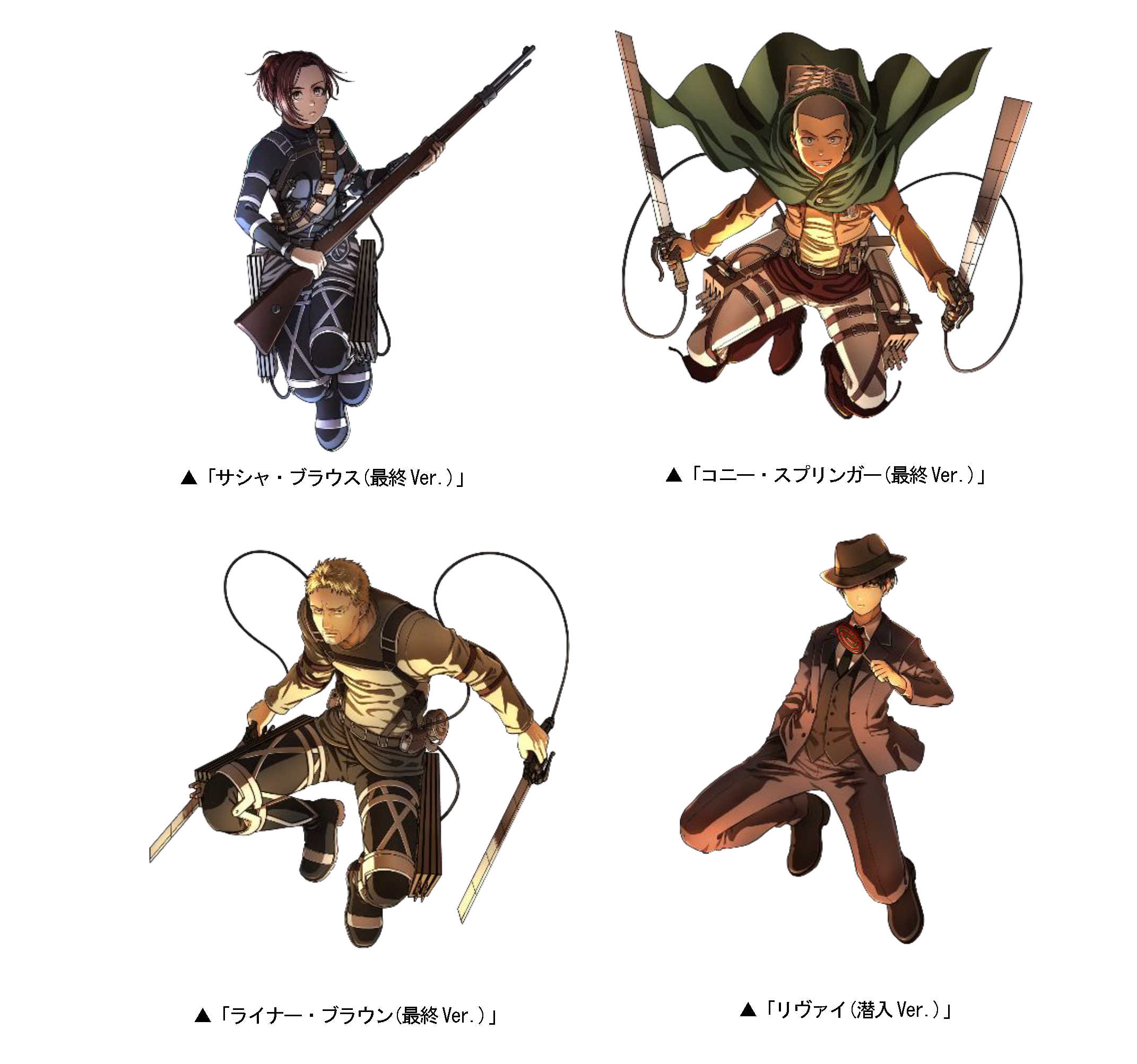 今回新たに「サシャ・ブラウス(最終Ver.)」「コニー・スプリンガー(最終Ver.)」「ライナー・ブラウン(最終Ver.)」、さらにリヴァイが新たな装いで新登場!