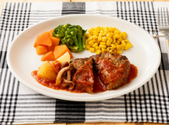 従来国産豚肉を使用していましたが、今回からは、豚肉の旨味をより感じれるように、石見ポークのスネ肉とウデ肉を使用。それに国産牛肉を使い、繋ぎとして、玉ねぎ、人参を入れて作りました。肉の挽き具合も6mmにこだわり、食感をよくする工夫をしました。ソースはトマトをベースにナツメグと黒胡椒を多めにしてコクを出してます。ハンバーグの大きさも210gとボリュームもあります。