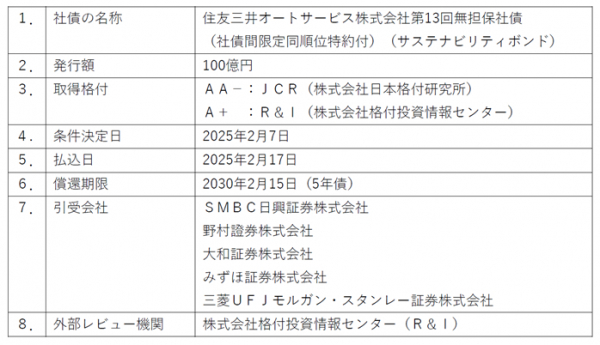 SMAS(住友三井オートサービス株式会社、本社:東京都新宿区 社長:佐藤 計)は、下記の通り、第13回無担保社債(サステナビリティボンド※1)の発行条件を決定致しましたので、お知らせします。