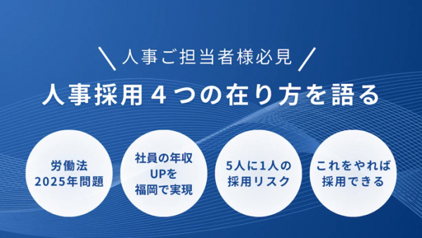 福岡の求人・転職メディア市場に向けて、福岡における優秀人材獲得の秘訣をはじめ、人材採用のトレンドや課題、リモートワークが進む中での採用活動の変化などをテーマにしたHRセミナー「人事ご担当者様必見!人事採用4つの在り方を語る」を2025年2月21日(金)に開催します。セミナーでは、社労士法人かぜよみ 代表社労士の肥海 聡芝氏およびT J会計ソリューション 代表税理士/株式会社みんなの真実 取締役副社長の成富 康裕氏をゲストに招き、各々の専門分野の立場から福岡におけるこれからの人事採用についてディスカッションを行います。