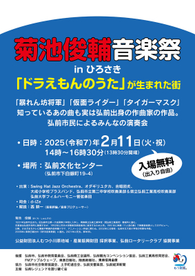 「ドラえもん」や「仮面ライダー」「タイガーマスク」の音楽を作曲した弘前出身の作曲家を、地元の音楽家、吹奏楽、ジャズバンド、合唱などで演奏する。