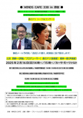 スリーシェルズの代表・西耕一は、自身が企画を担当した「森ミドリ・トーク&コンサート」を2月16日に、WINDS CAFE 338として、原宿のカーサモーツァルトで開催することを、2月10日に発表しました。