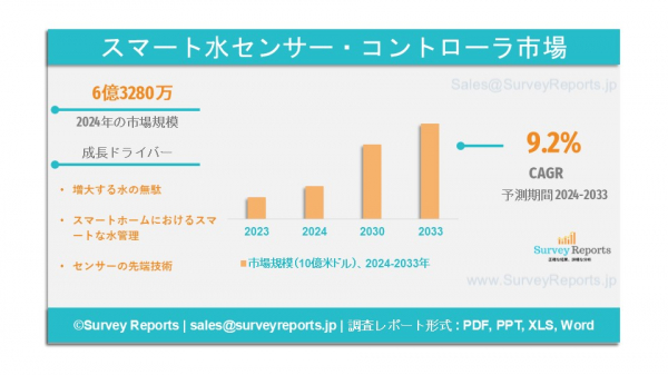 Survey Reports LLCは、2025年2月にスマート水センサーおよびコントローラー市場に関する調査レポートを発行したと発表した。製品タイプ別(水センサー、水コントローラー、水モニタリングシステム、スマート水流量制御システム)、技術別(ワイヤレスシステム、有線システム)、エンドユーザー別(住宅用、商業用、産業用)に - 2024年から2033年までのスマート水センサーおよびコントローラー市場の予測評価を提供するグローバル市場分析、動向、機会および予測。スマート水センサーおよびコントローラー市場の成長促進要因、市場機会、課題、脅威など、いくつかの主要な市場力学を強調している。