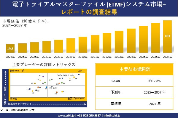 SDKI Analytics(本社:東京都渋谷区)は、このたび、2025年02月12に「電子トライアルマスターファイル (ETMF)システム市場調査レポート:2025-2037年の市場規模、シェア、傾向の予測」を発表しました。電子トライアルマスターファイル (ETMF)システムに関する市場調査レポートには、統計的および分析的アプローチを使用した予測評価が含まれています。この調査レポートでは、一次および二次調査方法を使用して分析された主要な業界洞察を通じて将来の傾向を理解できるようにすることで、主要な市場動向を読者に説明しています。