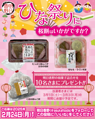そんな明日香野から、2月10日に開始した「ひな祭りに桜餅はいかがですか?」キャンペーンのご案内です。