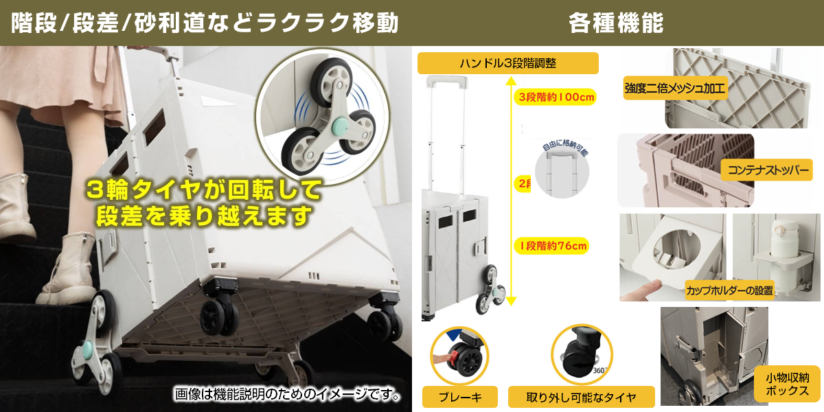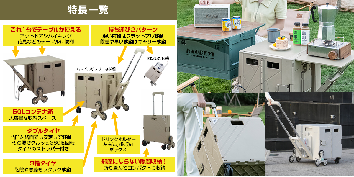 「3Wayコンテナキャリー」は大容量50Lの収納力とテーブル機能を備え、多目的に使えます。3輪タイヤとダブルタイヤにより、階段や段差、砂利道でも安定した移動が可能です。折り畳み収納やハンドルの高さ調整機能など使いやすい。アウトドア、オフィス、イベント、家庭、買い物、花見などの整理整頓・収納・運搬など活躍します。360度回転とブレーキ機能付きで、狭い場所でもスムーズに方向転換可能。ドリンクホルダーと小物収納ボックスも付いており、さらに便利です。