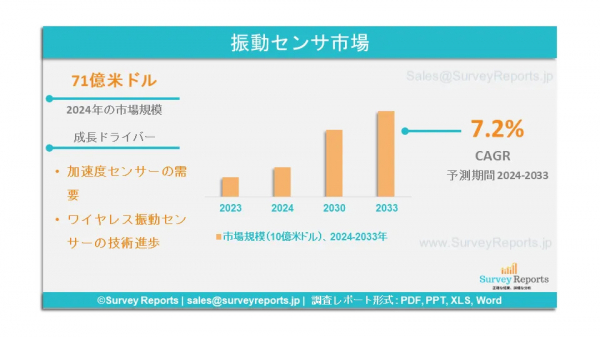 Survey Reports LLCは、2025年2月に振動センサー市場に関する調査レポートを発行したと発表した。同レポートでは、タイプ別(加速度計、速度センサー、変位センサー、その他)、技術別(圧電抵抗、ストレインゲージ、可変容量、ハンドプローブ、光学、3軸、その他)、素材別(圧電セラミック、ドープドシリコン、石英、その他)、 モニタリングプロセス別(オンライン振動モニタリング、ポータブル振動モニタリング、その他)、用途別(組み込みシステム、予測メンテナンス振動分析器、研究開発、その他)、エンドユース別(自動車、石油・ガス、ヘルスケア、航空宇宙・防衛、エネルギー・電力、その他) - 2024年から2033年までの世界市場分析、動向、機会、予測を提供する。これは、振動センサ市場の予測評価を提供する。振動センサー市場の成長促進要因、市場機会、課題、脅威など、いくつかの重要な市場力学に焦点を当てている。