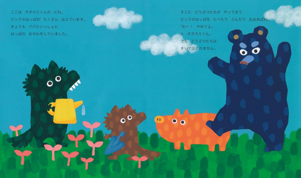オオカミくんが、庭でピンクの葉っぱを育てていると