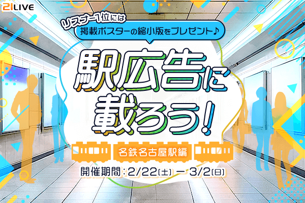 株式会社エムアンドティーティー(本社:沖縄県北谷町、代表取締役:井藤 三知子)が運営するエンターテイメント・ライブ配信アプリ【21LIVE(ニーイチライブ)】URL: https://21.live では、2月22日(土)より『駅広告に載ろう~名鉄名古屋駅編~』を開催。5万GOLD達成者にはポスター掲載権をプレゼントします。