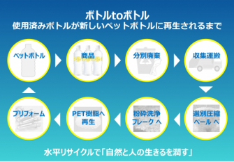 水平リサイクルの流れとして、鳥取県西部広域行政管理組合リサイクルプラザに搬入された使用済みペットボトルは、選別・圧縮・梱包処理した後、鳥取県西部再生資源事業協同組合で選別・粉砕処理。(※境港市分については鳥取県西部再生資源事業協同組合に直接搬入後、選別・破砕処理される。)これをリサイクル業者にて新たなペットボトル容器の原材料に生まれ変わらせ、永伸商事株式会社が飲料製造に使用します。