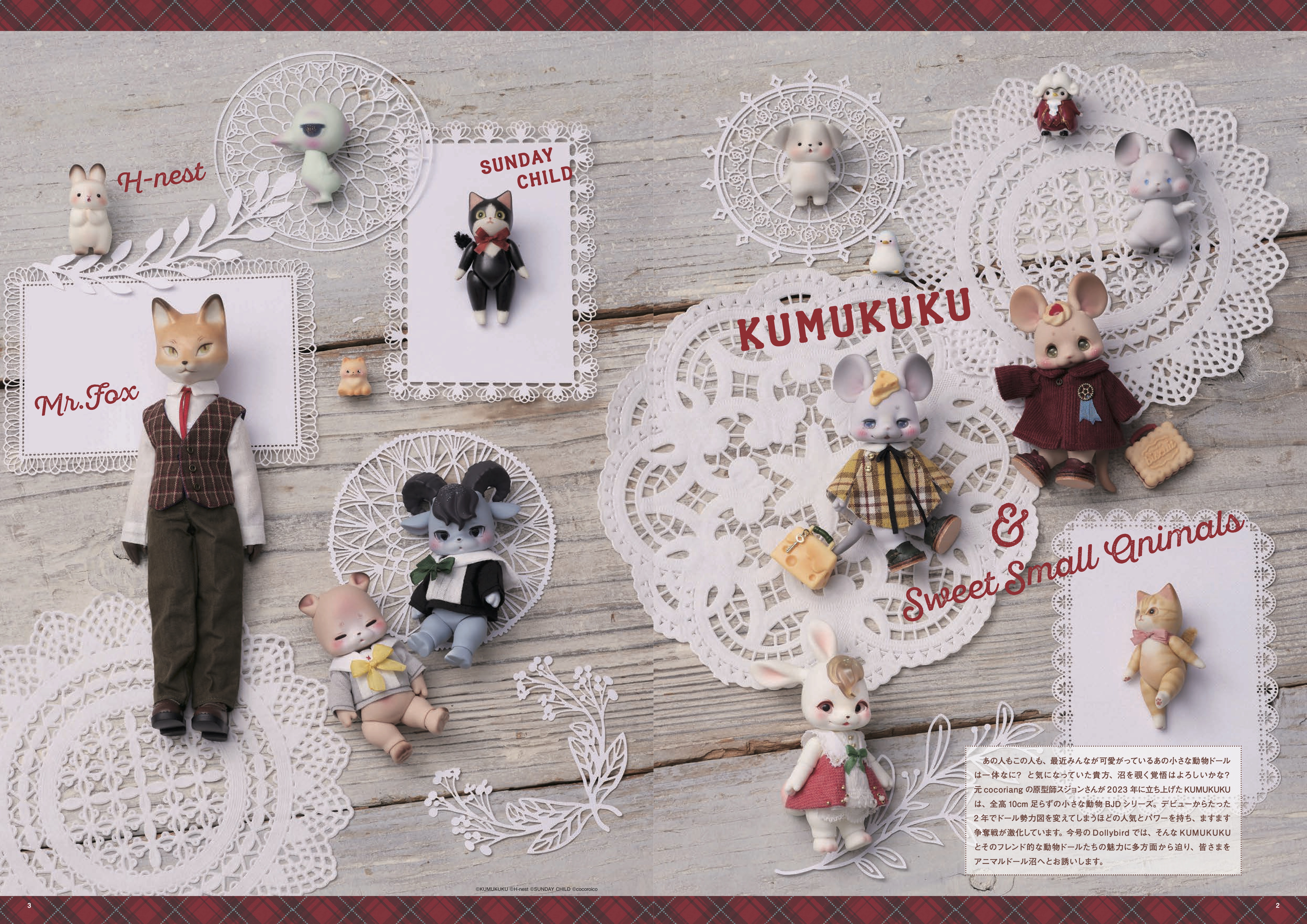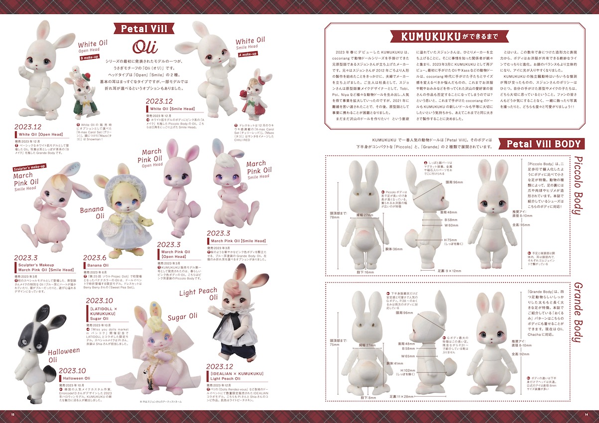 特集では、デビューから2年でリリースされた約50種のドールをまとめたカタログを掲載。cocoriang時代から歴代の動物シリーズを手がけてきたスジョンさんに、色鉛筆でできる簡単メイク方法を教えていただきました。そのほか、Blanc*Coutureさんによる靴の作り方、ベビ堂さんによるおくるみの作り方を掲載いたします。