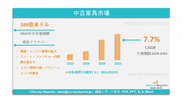 Survey Reports LLCは、2025年2月に中古家具市場に関する調査レポートを発行したと発表した。このレポートでは、製品(ベッド、テーブル&デスク、ソファ&カウチ、椅子&スツール、キャビネット&シェルフ、その他)別、素材(金属、木材、プラスチック、ガラス、その他)別、用途(住宅用、商業用、その他)別の中古家具市場の - グローバル市場分析、動向、機会、予測、2024年から2033年は、中古家具市場の予測評価を提供する。中古家具市場の成長促進要因、市場機会、課題、脅威など、いくつかの重要な市場力学を強調している。