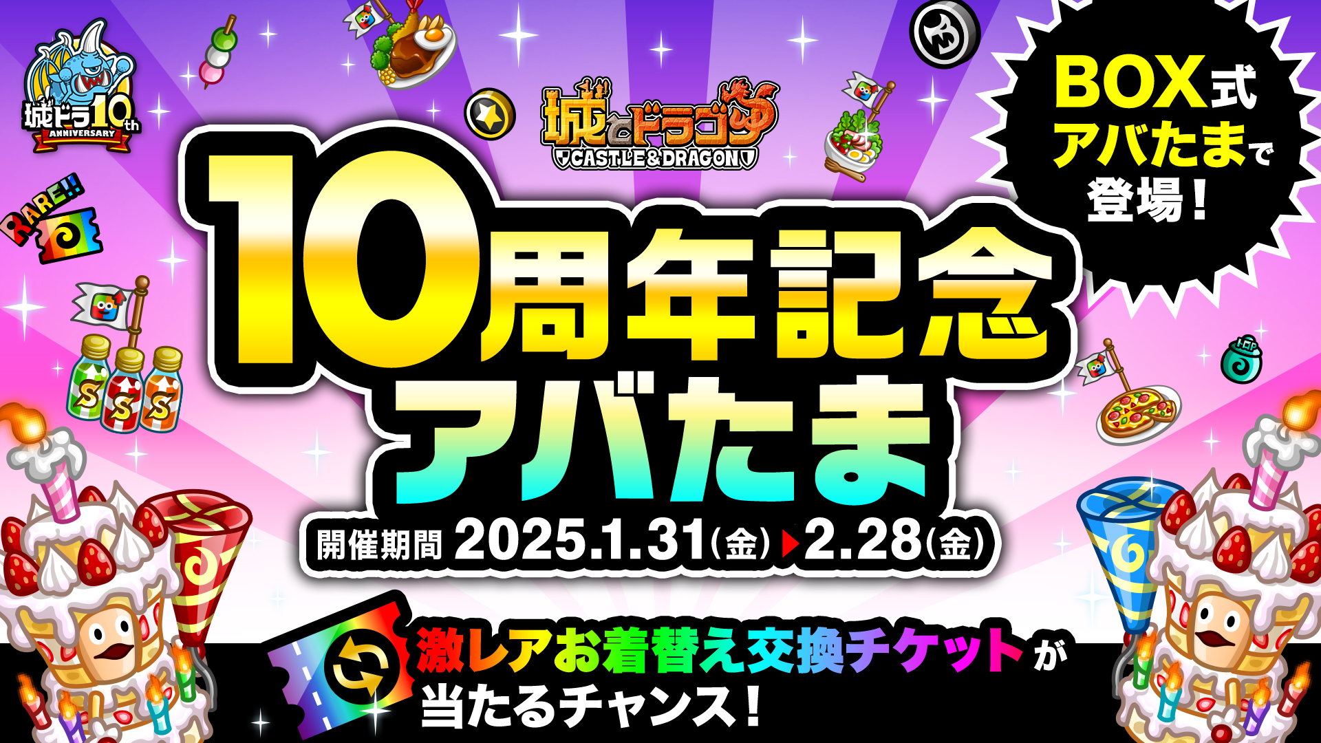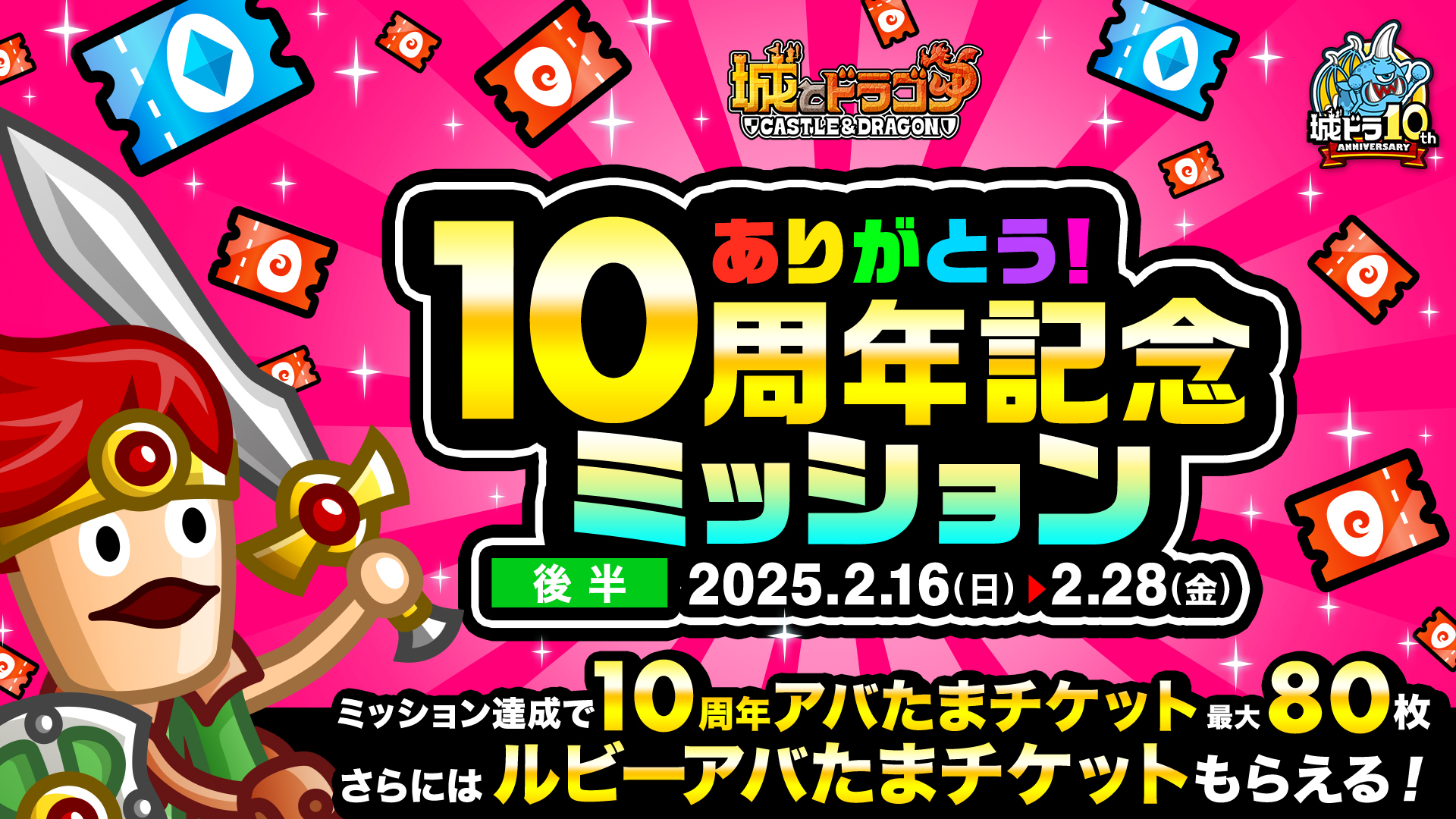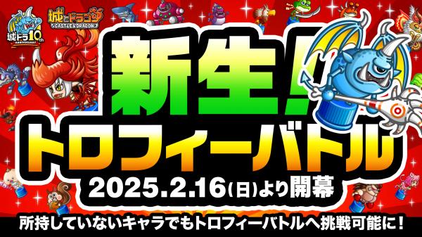 現在開催中の『城とドラゴン』10周年記念キャンペーン「ありがとう10周年!城ドラ超感謝祭」の“後半”が、2月16日(日)より開催中です。前半に引き続き特別なログインボーナスやミッションはもちろん、1日1回最大“10,100ルビー”が当たる!?「10周年ルビーアバたま」も実施!さらに新たなキャンペーンとして「新生!トロフィーバトル」や、新たな機能「祝福」を使ったキャンペーンも実施いたします。後半も『城とドラゴン』のお祭りをぜひお楽しみください!