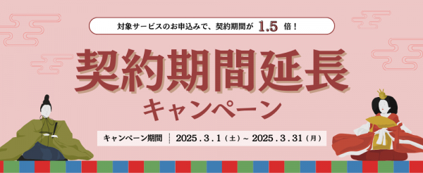契約期間延長キャンペーンでは、Winserverの対象サービスにお申込みいただくと、ご利用料金はそのままで、契約期間を1.5倍に延長いたします。