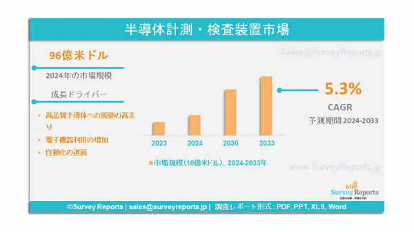 Survey Reports LLCは、2025年2月、半導体計測・検査装置市場のセグメンテーションに関する調査レポートを発行したと発表した。タイプ別(ウェハ検査システム、マスク検査システム、薄膜計測、バンプ検査、リードフレーム検査)、技術別(光学、電子ビーム、その他)、用途別(集積回路製造、発光ダイオード(LED)製造、ディスクリートデバイス、パッケージングおよびアセンブリ、その他)、 用途別(半導体ファウンドリ、集積回路製造業者(IDMS)、サードパーティ事業(OSAT)、研究開発(R&D)機関) - 半導体計測・検査装置市場の予測評価を提供する世界市場分析、動向、機会および予測、2024年から2033年。半導体計測・検査装置市場の成長要因、市場機会、課題、脅威など、いくつかの重要な市場力学に焦点を当てている。