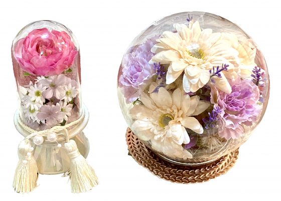 アートフラワーで出来た小型仏花・円形グラス・コンポート仏花・ペット用仏花も取り扱いを強化しています。