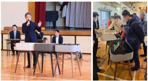 今回、練馬区豊玉地区の3つの町会が合同で行った「防災訓練」には、地域住民約150名と練馬区立豊玉中学校の生徒約40名が参加。有事の際、中学生が主体的に避難拠点の運営を行うことを想定した訓練が行われました。「子どもたちが“もしものとき”を、未来視点で考えるきっかけにしたい」とのご要望を受け、『モビリティキッチン』の他、異なる形態のろ過循環装置を提供。炊き出し作業時の手洗い場を想定して、活用いただきました。当社としては、避難拠点での具体的なニーズの洗い出しや、また、非常食でのアレンジ調理をデモンストレーションする機会をいただきました。