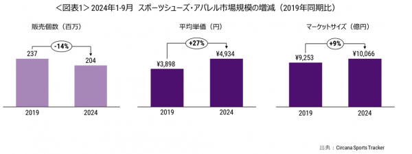 日本の2024年1-9月のスポーツシューズ・アパレル市場規模は1兆66億円で、コロナ前の19年同期比813億円増でした(図表1)。内訳を見ると、特に平均単価が19年同期比1036円、27%の上昇し、市場の拡大に最も寄与しました。一方、販売個数は14%減と、消費者の苦しい懐具合も透けて見える結果となりました。