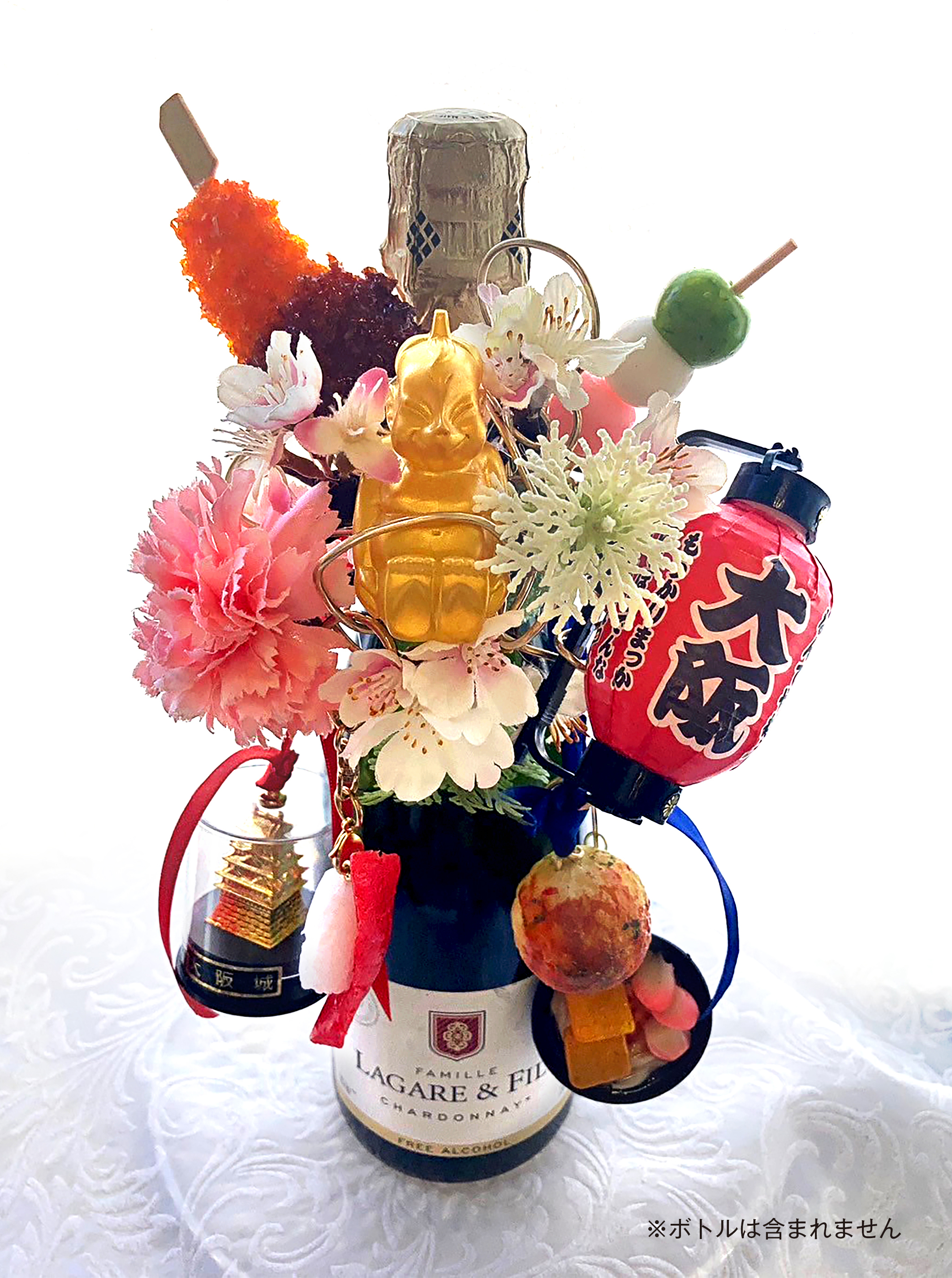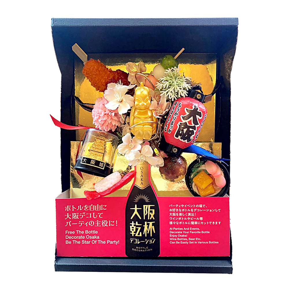大阪は「食い倒れの街」「天下の台所」として知られ、豊かな食文化とユーモアに満ちた伝統風土がその魅力です。「大阪乾杯デコレーション」は、訪日外国人にも人気の高い食品サンプル技術を活用し、大阪らしい活気と遊び心、そして洗練されたデザインを表現しました。さらに、国花であり市花でもある桜、大阪城といった地域性を象徴するモチーフを取り入れたデザインは、国内外の観光客に大阪への愛着と特別感を感じさせるお土産や、パーティ、大阪での開店祝いのなど、サプライズのあるギフトに最適です。
