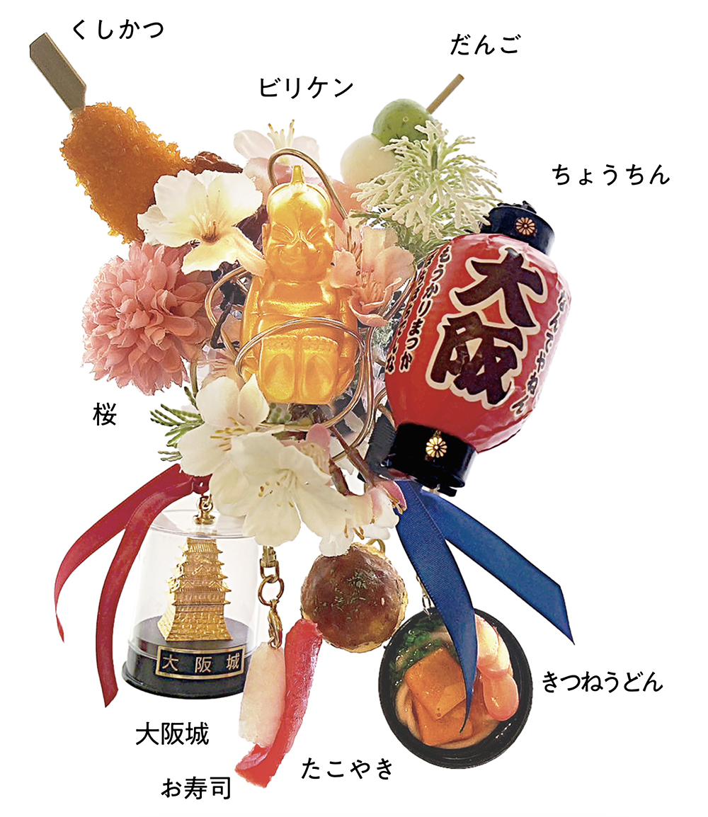 素材:アートフラワー桜(ポリエステル・ポリプロピレン等)土台ドライソリッドフォームミニ食品サンプル:たこ焼き・串カツ・寿司・団子・ビリケン・大阪城・大阪提灯(ポリ塩化ビニル・アクリル樹脂・アクリル油性塗料・紙 等)