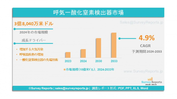 Survey Reports LLCは、2025年2月に呼気一酸化窒素検出器市場のセグメンテーションに関する調査レポートを発行したと発表した。製品タイプ別(ポータブル一酸化窒素検出器、卓上型一酸化窒素検出器、携帯型一酸化窒素検出器)、用途別(喘息モニタリング、アレルギー検査、慢性閉塞性肺疾患(COPD)管理、研究および臨床試験)、 エンドユーザー別(医療機関、在宅医療、研究施設、診断センター)、技術別(電気化学技術、光音響技術、赤外分光法、化学発光検出)、流通チャネル別(直接販売、オンライン販売、代理店/卸売業者、小売薬局) - 2024年から2033年までのグローバル市場分析、動向、機会、予測を提供する「Exhaled Nitric Oxide Detectors Market(呼気一酸化窒素検出器市場)」。このレポートでは、呼気一酸化窒素検出器市場の成長促進要因、市場機会、課題、脅威など、いくつかの重要な市場力学に焦点を当てている。