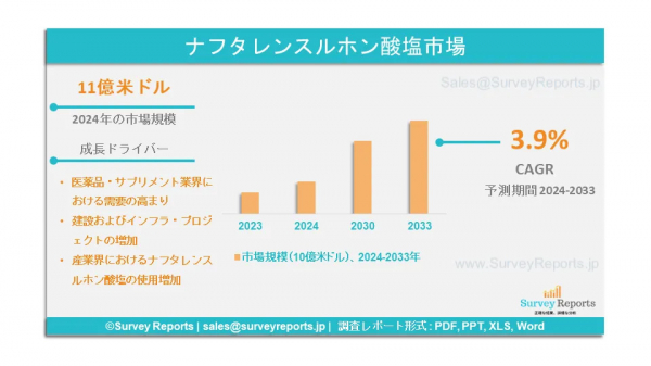 Survey Reports LLCは、2025年2月、ナフタレンスルホン酸塩市場のセグメント化に関する調査レポートを発行したと発表した。形態別(液体および粉末)、用途別(分散剤および湿潤剤、可塑剤、界面活性剤、その他)、最終用途産業別(建築および建設、農業、家庭用クリーニング、繊維、その他) - ナフタレンスルホン酸市場の予測評価を提供する「グローバル市場分析、動向、機会、予測、2024年から2033年」。ナフタレンスルホン酸市場の成長促進要因、市場機会、課題、脅威など、いくつかの主要な市場力学に焦点を当てている。