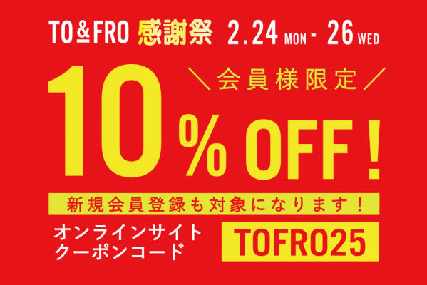 「TO&FRO感謝祭」を実施する2/24(月・祝)~2/26(水)の3日間は、全アイテムを10%オフでお得にお買い求めいただけます。他ブランドとのコラボレーションアイテムなど、「TO&FRO感謝祭」でしか割引対象とならないアイテムもございますので、この機会に気になるTO&FROのアイテムを手にしていただけるとうれしいです。