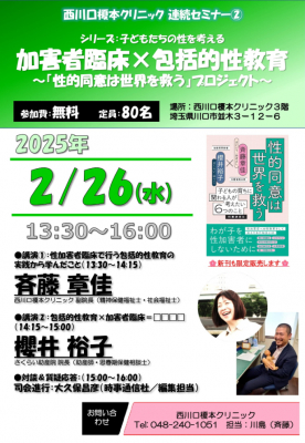 西川口榎本クリニックの斎藤章佳氏は長年加害者臨床で痴漢、盗撮、露出、レイプ、下着窃盗などの当事者と向き合ってきて、その中で包括的性教育を取り入れたいとの思いから櫻井氏と共同で2022年に性犯罪再犯防止プログラムにおける包括的性教育の取り組みを開始した。
