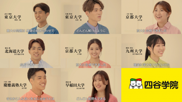 毎年、四谷学院の卒業生が、自分の言葉で語っているCM。「四谷学院は、ここが違う。」をテーマに話してくれています。先輩たちは四谷学院をどう活用して学力を伸ばしていったのか?実際に合格を勝ち取った先輩からの生の声をご覧ください。
