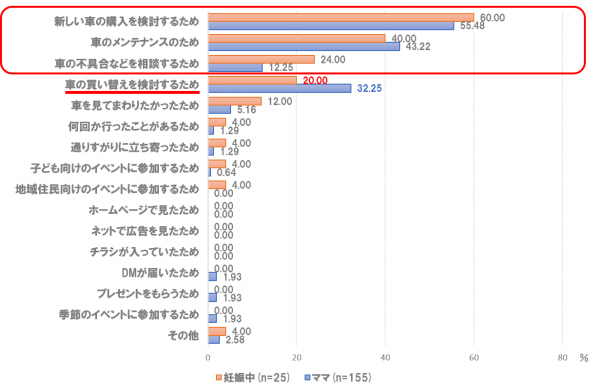 カーディーラーへの訪問理由は、「新しい車の購入を検討するため」が約6割(妊娠中の女性60.00%、ママ55.48%)、「車のメンテナンスのため」が約4割(妊娠中の女性40.00%、ママ43.22%)、「車の買い替えを検討するため」と回答した割合は、妊娠中の女性は20.00%に対して、0歳以上の子を持つママは32.25%となり、12.25ptの差があった(図2)。