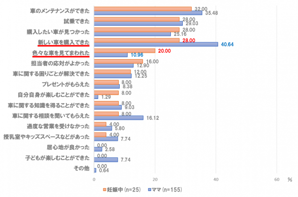 カーディーラーへの訪問経験のある方に、カーディーラーへ行って良かったことを聞いた(図3)。「新しい車を購入できた」と回答した割合は、妊娠中の女性は28.00%、ママは40.64%と12.64ptの差があった。一方、「色々な車を見てまわれた」と回答した割合は、妊娠中の女性は20.00%、ママは10.96%と9.04ptの差があった。これらの結果から、妊娠中は購入したい車をじっくり検討し、出産を機に購入を決断していると推察される。