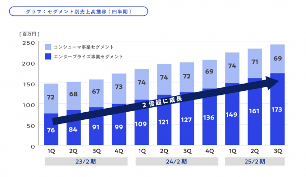 2025年2月現在、累計会員数122万人超、累計法人導入社数1,100社超となり、特に「flier business」をはじめとする法人向け事業が好調で、法人向け事業の売上は2年間で約2.2倍(2023年2月期第1四半期から2025年2月期第3四半期)となり、現在全社売上の約7割を占めています。今後さらに成長スピードを加速するために、知名度、信頼度の向上、及び内部管理体制の強化を目的として、東京証券取引所グロース市場へ新規上場いたしました。