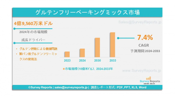 Survey Reports LLCは、2025年2月にグルテンフリーベーキングミックス市場に関する調査レポートを発行したと発表した。このレポートでは、グルテンフリーベーキングミックス市場の予測評価を提供している。Eコマースサイト、その他) - グローバル市場分析、動向、機会、予測、2024年から2033年 - グルテンフリーベーキングミックス市場の予測評価を提供する。グルテンフリーベーキングミックス市場の成長促進要因、市場機会、課題、脅威など、いくつかの主要な市場力学に焦点を当てている。