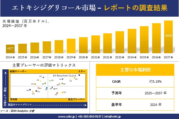 SDKI Analytics(本社:東京都渋谷区)は、このたび、2025年02月20に「エトキシジグリコール市場調査レポート:2025-2037年の市場規模、シェア、傾向の予測」を発表しました。エトキシジグリコールに関する市場調査レポートには、統計的および分析的アプローチを使用した予測評価が含まれています。この調査レポートでは、一次および二次調査方法を使用して分析された主要な業界洞察を通じて将来の傾向を理解できるようにすることで、主要な市場動向を読者に説明しています。