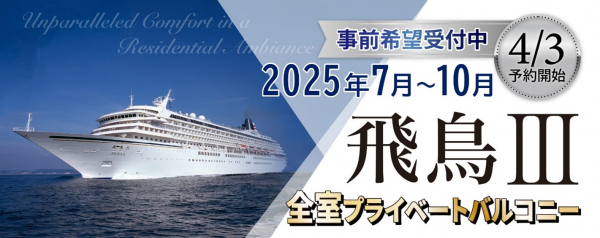 クルーズ予約サイト「ベストワンクルーズ」運営の株式会社ベストワンドットコム(本社:東京都新宿区、代表取締役:澤田秀太、野本洋平)は、待望の「飛鳥III」の運航スケジュールが発表されましたので、本日より事前相談、予約希望受付を開始いたします。なお、販売開始は2025年4月3日(木)午前10時30分からとなります。