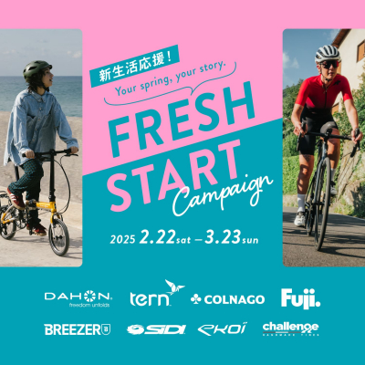 まだまだ寒さの厳しい日が続きますが、待望の春は着実に近づいてきています。過ごしやすい気候の中でサイクリングをすると心もウキウキしますよね。4月からの新生活に向けて新しい自転車を用意したり、今乗ってる自転車のコンディションを良くしておくのも今がチャンス。そこでSHIFTAでは新生活応援を目的に「FRESH START CAMPAIGN」を実施いたします。