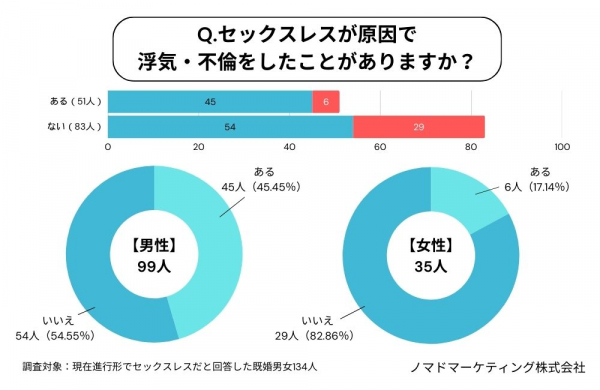 まず、現在進行形でセックスレスだと回答した男女134人(男性99人・女性35人)に対し、セックスレスが原因で浮気や不倫をしたことがあるか聞きました。