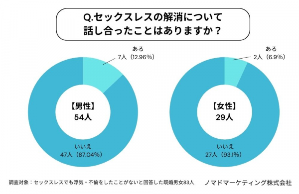 セックスレスでも浮気・不倫をしたことがないと回答した男女83人(男性54人・女性29人)に、セックスレスの解消についてパートナーと話し合ったことがあるかどうかを聞きました。