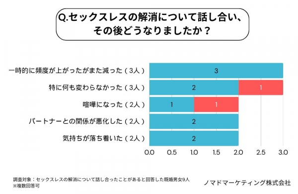 残念ながら、話し合いによってすべて解決とはならなかったようです。話し合いを経て一時的にセックスの頻度は上がったもののまた減っていったという人、特に何も変わらなかったという人、さらに喧嘩に発展したという人も見られました。