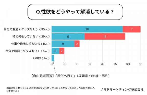 セックスレスの解消について話し合ったことがないと回答した男女74人(男性47人・女性27人)に対し、性欲をどうやって解消しているのかを聞きました。