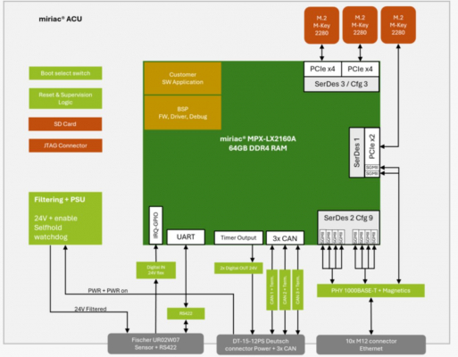 タスク最適化されたCOTS MicroSysキャリアは、miriac MPX-LX2160A、FPGAアクセラレータモジュール、最大3つのSSD RAMモジュール、または1~2個のHailo-8 AIプロセッサモジュールを搭載可能です。別個のセーフティアイランドが必要な場合、miriac MPX-S32G274AまたはmiriacMPX-S32G399Aに基づく拡張が提供されます。