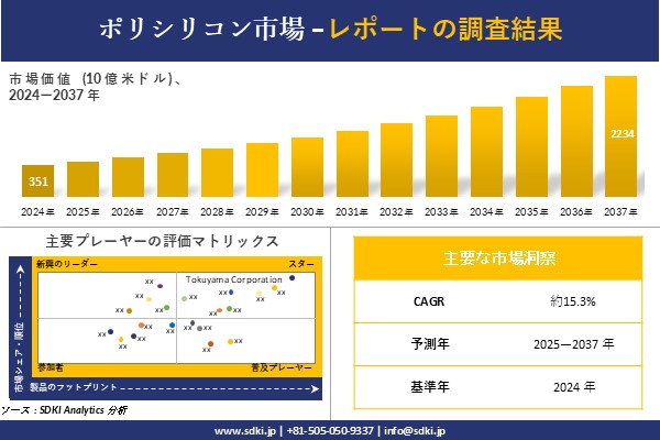 SDKI Analytics(本社:東京都渋谷区)は、このたび、2025年02月20に「ポリシリコン市場調査レポート:2025-2037年の市場規模、シェア、傾向の予測」を発表しました。ポリシリコンに関する市場調査レポートには、統計的および分析的アプローチを使用した予測評価が含まれています。この調査レポートでは、一次および二次調査方法を使用して分析された主要な業界洞察を通じて将来の傾向を理解できるようにすることで、主要な市場動向を読者に説明しています。