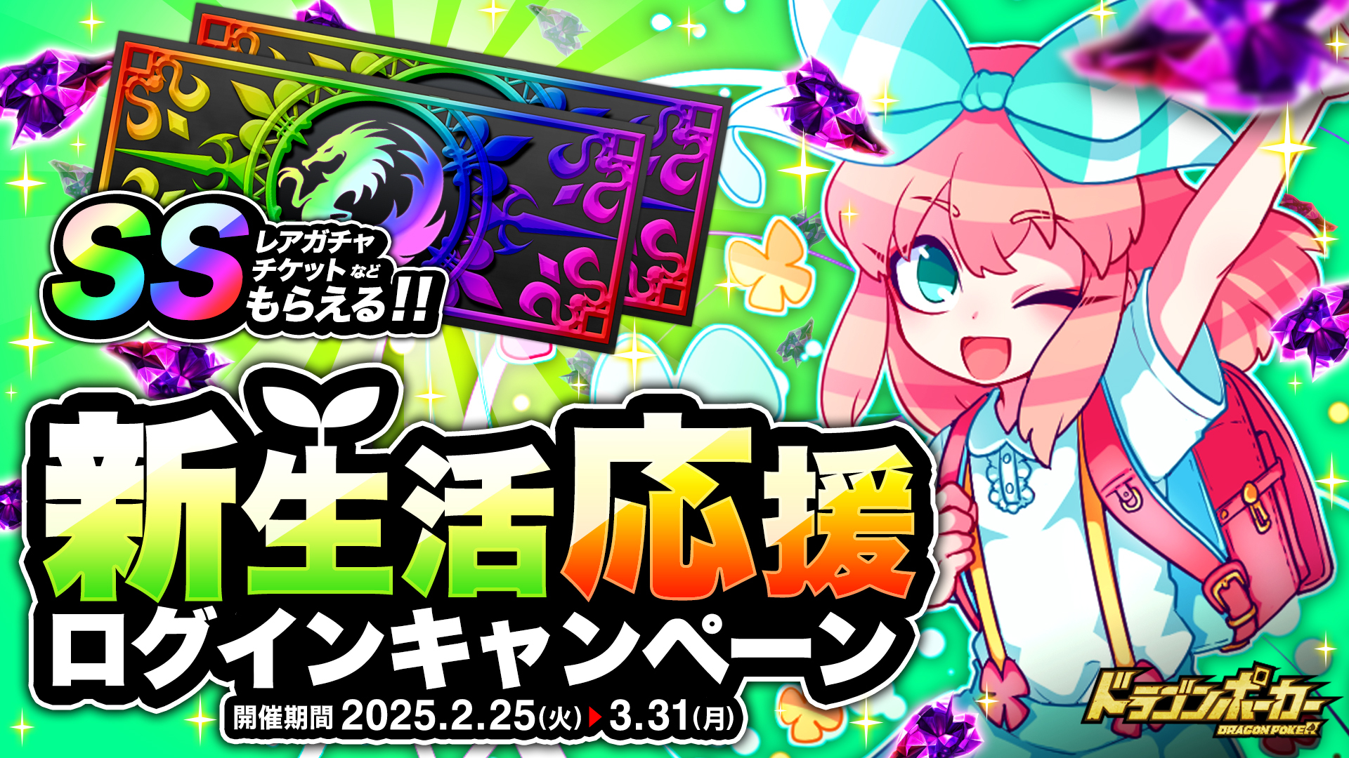 期間中、25日間ログインすると、竜石が最大35個もらえる「新生活応援ログインキャンペーン」を開催いたします。5日ログインごとに「SSレアガチャチケット」などアイテムをプレゼント!『ドラゴンポーカー』に毎日ログインして、アイテムを受け取りましょう!
