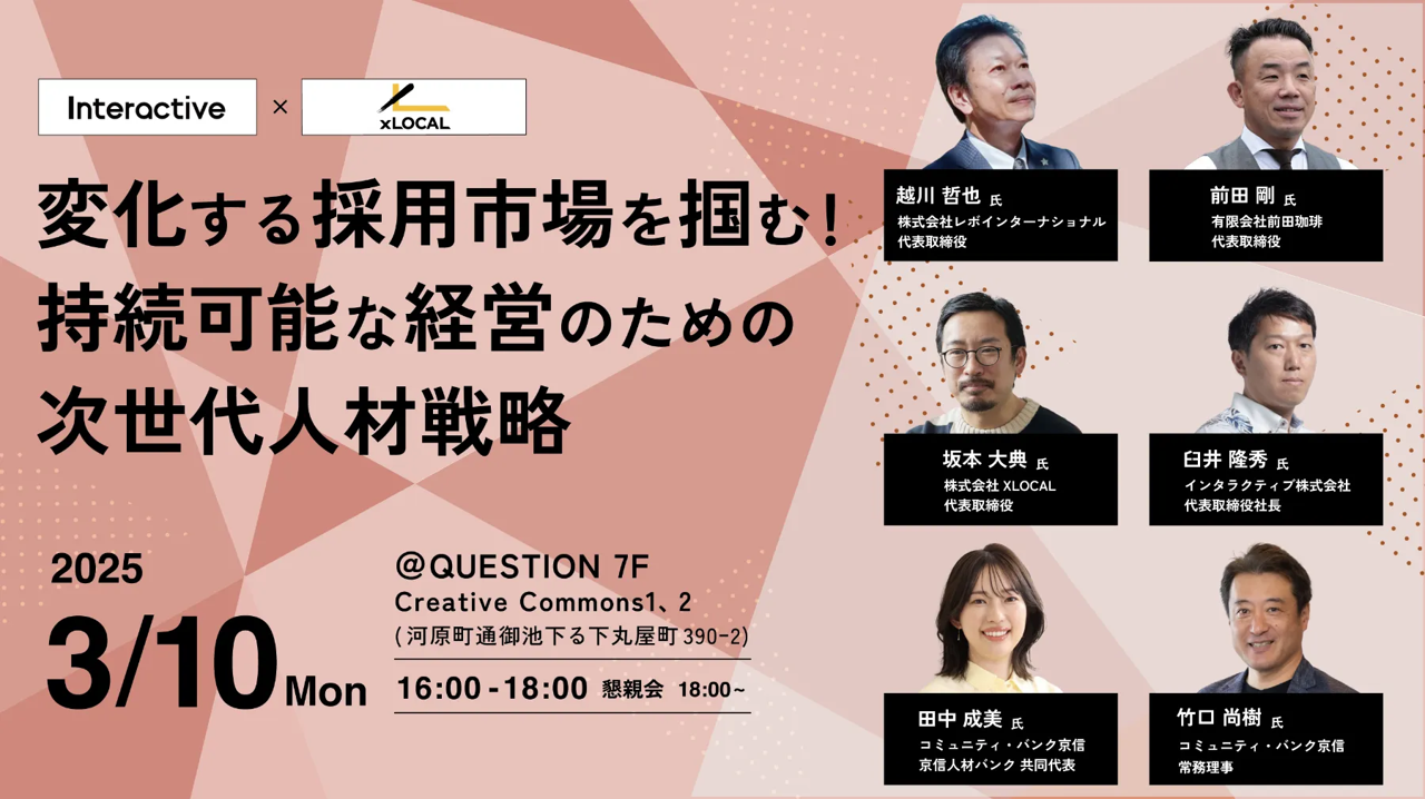 京都の求人・転職メディア市場に向けて、「ジョブアンテナ」および「チイキズカン」の認知向上を目的に、地方企業が持続的に成長するための人材戦略をテーマにしたHRセミナー「持続可能な経営のための次世代人材戦略」を2025年3月10日(月)に開催します。セミナーでは、インタラクティブおよびXLOCAL両社の代表者に加えて、協力企業のコミュニティ・バンク京信から田中 成美氏および竹口 尚樹氏、また京都府内外で注目を浴びている経営者をゲストに招き、「変化する採用市場と企業成長を支える人材戦略」や「プロフェッショナル人材の実践的活用法」をテーマにセッションを行います。