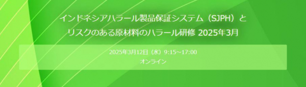 株式会社矢野経済研究所(本社:東京都中野区、代表取締役社長:水越 孝)とインドネシア政府公認の研修機関であるIHATECは、3月12日、インドネシアのハラール製品保証システム(以下、SJPH)とハラールにおけるリスクのある原材料と説明文書について、研修をオンラインで開催いたします。