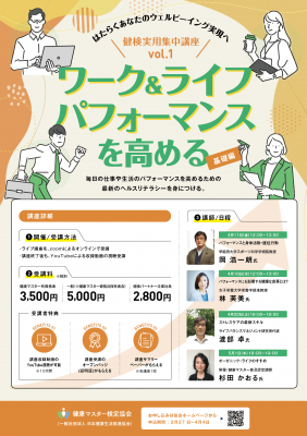 健康マスター検定協会(一般社団法人日本健康生活推進協会)は、人生100年時代、ウェルビーイング・ライフを支える社会のヘルスリテラシー向上に向け、【健検/日本健康マスター検定】を中心に事業を展開してまいりましたが、この度新たに、はたらく方々を対象に仕事や生活の場面で活かせる、より実用的、実践的な健康知識、ヘルスリテラシーまなびの機会を更に広く提供すべく、新たに「健検実用集中講座」を開設いたします。 第一回目のテーマは、はたらく皆さま方の関心が高い「ワーク&ライフ・パフォーマンス」。 4月~5月に4名の先生方による講座が開催されます。健康マスター名誉リーダーの俳優・杉田かおるさんも登壇します。受講申し込みは2月27日から開始しましたので(4月4日まで)、ぜひ受講をご検討願います。