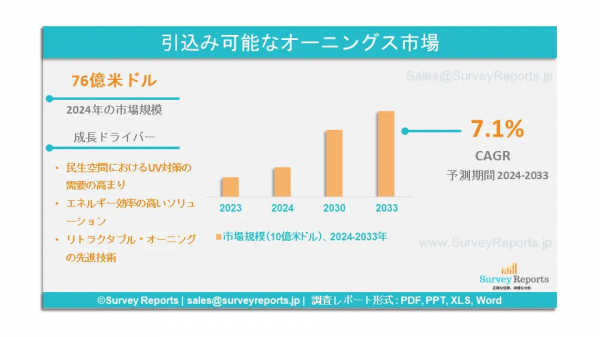 Survey Reports LLCは、2025年2月に調査レポート「格納式オーニング市場のセグメンテーション:タイプ別(固定式、格納式、その他)、製品別(パティオ、窓、自立型、その他)、エンドユーザー別(住宅用、非住宅用、その他) - 2024年から2033年までの世界市場分析、動向、機会、予測を提供するレポート。これは、引き込み式オーニング市場の予測評価を提供するもので、引き込み式オーニング市場の成長促進要因、市場機会、課題、脅威など、いくつかの重要な市場力学に焦点を当てている。