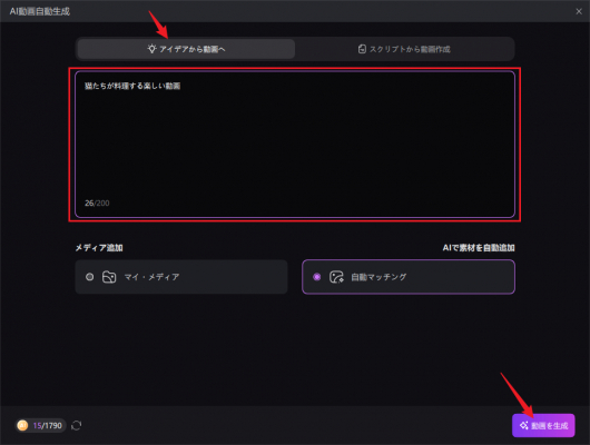「AIビデオジェネレーター」機能を選択し、動画にしたいアイデアやシナリオをテキストで入力します。シンプルな文章やテーマだけで長編動画を作成できます。